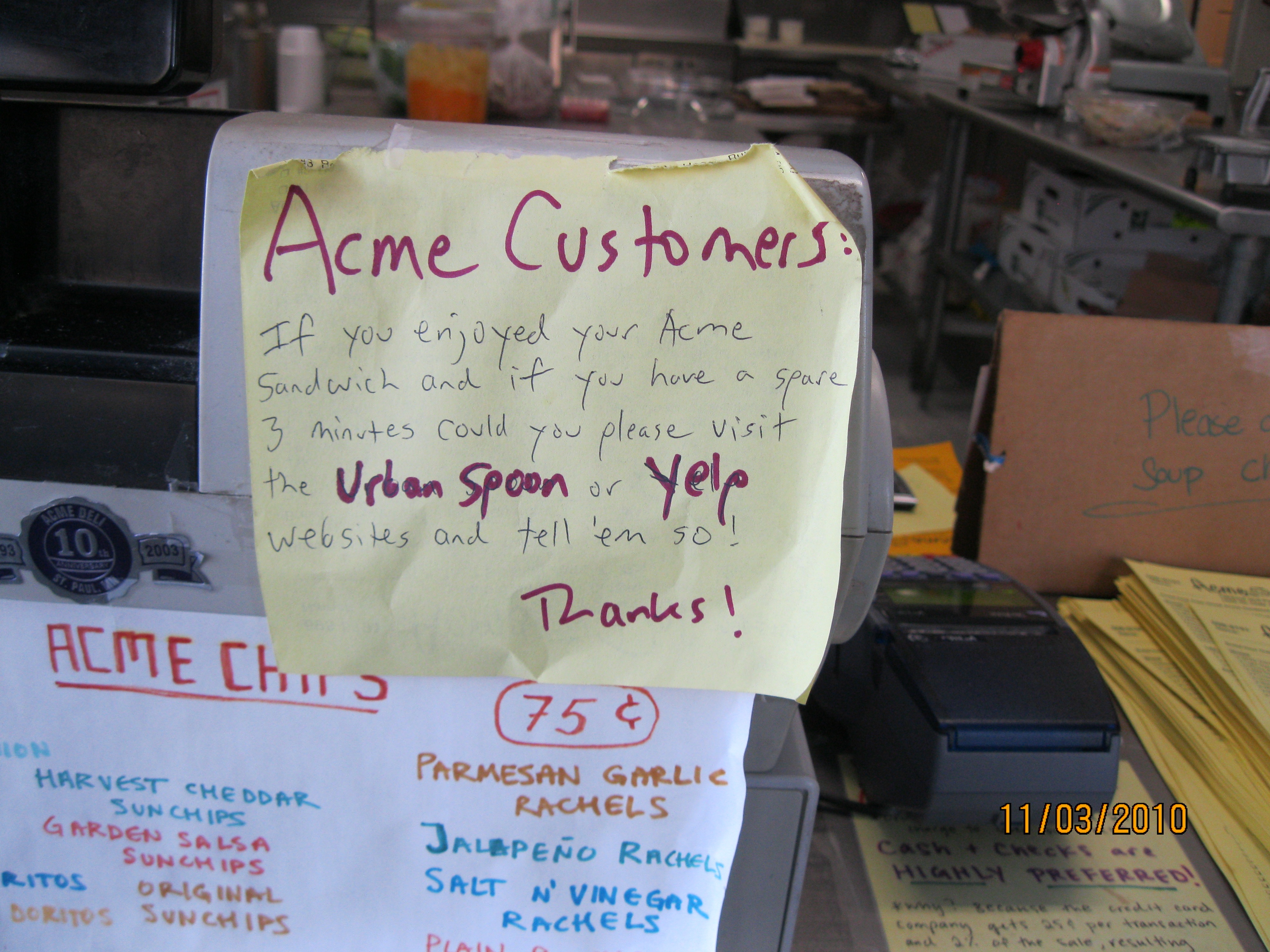 I “yelped” because Acme Deli asked me to with their handwritten sign taped to the register.