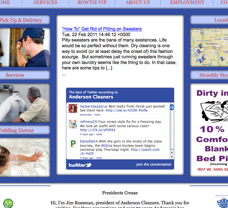 Case in point, Reid’s company manages the fantastic, interactive marketing presence of Anderson Dry Cleaners. I’d never really thought about my relationship with my dry cleaner until I saw this website. Dry cleaning is just not fun, like shopping for a smart phone app is. But Anderson’s now my source for information — the stuff I need to know on caring for my clothes because of their content-rich website. Will that make me buy their services? Probably! Reid walked my students through Anderson’s website and its use of social media to enhance the customer experience and ultimately grow revenue. It was a fascinating experience augmented by Twittering through the presentation.