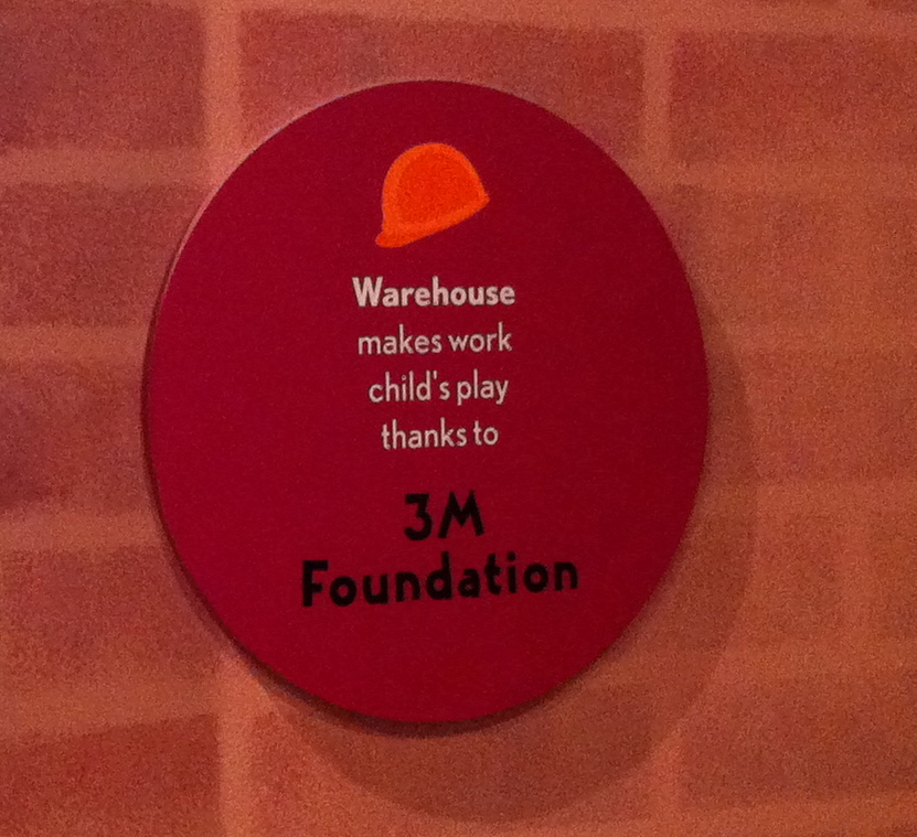 The manufacturing plant at my children’s museum is sponsored by 3M. This little plaque is seen by hundreds of parents every day as they play warehouse with their kids — moving blocks on hand-turned conveyor belts, moving blocks to the shipping center, shouting orders from floor to floor.