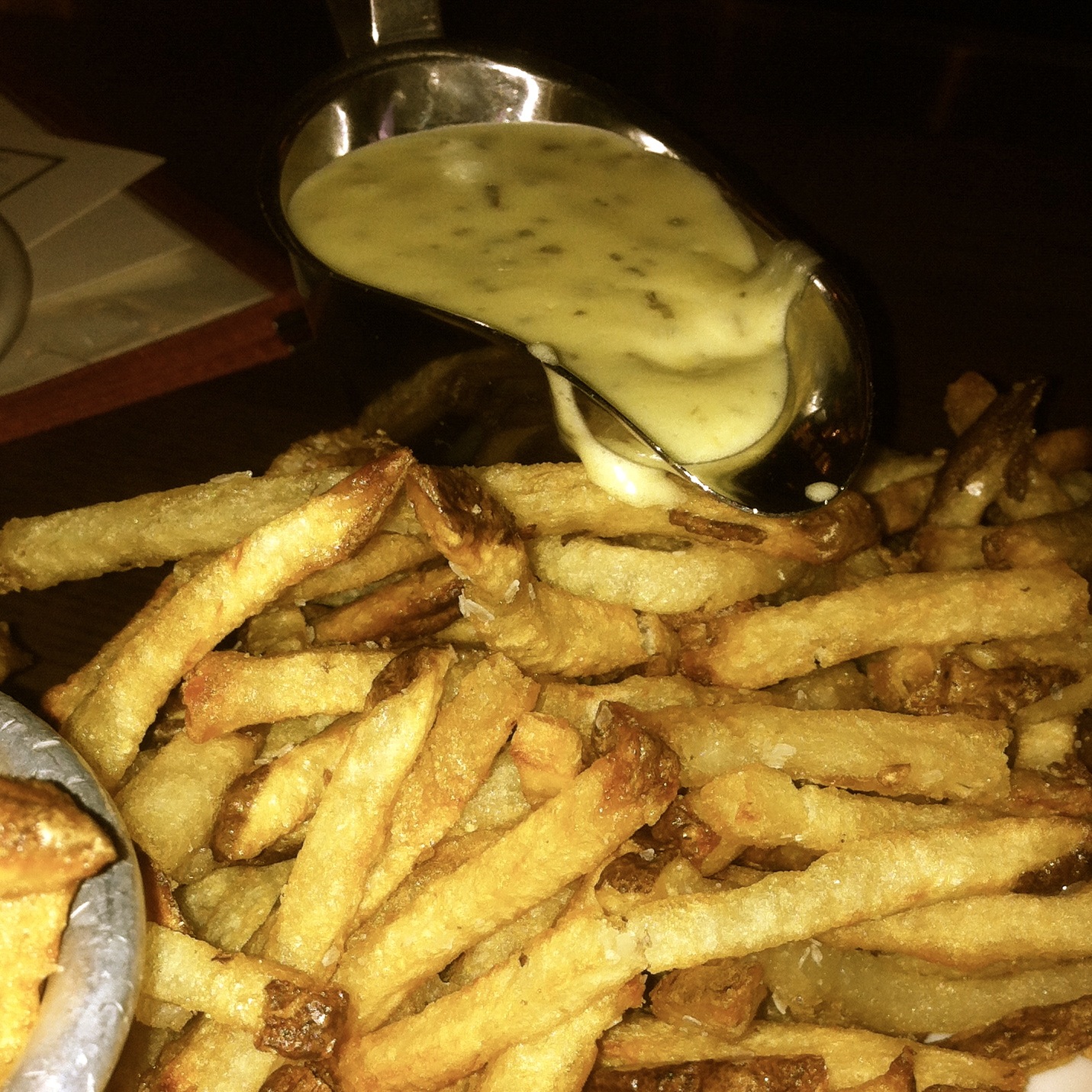 After this fun hour of book shopping, we continued our French experience next door for pommes frites at Salut Bar Américain. They have an awesome menu: pommes frites with Bernaise, Escargot Bourguignon (snails in herb butter), and Moules (mussels steamed in white wine with herb butter) — none of which should be eaten in one sitting. My son and I split the frites and colored the cows on the kid menu while learning the French for those special cuts of meat so popular in France: tripe (stomach lining), cervelle de veau (calf brains), and the ever-so-yummy ris de veau (thymus gland). Oddly I couldn’t find any on the menu.