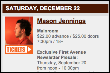 Tomorrow everyone can buy tickets to Mason Jenning’s December 22nd show. But today, me–I’m special. I have the secret code. I could buy tickets at noon today!
